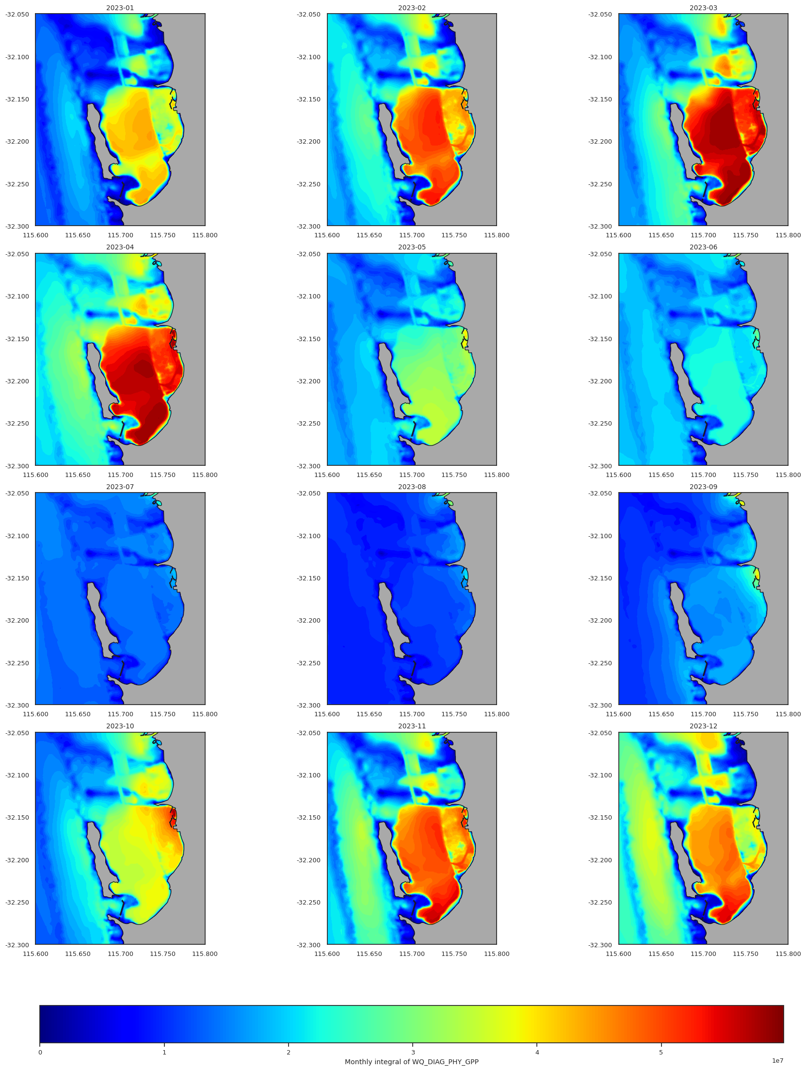 The variability in biomass reflects the spatial variability in depth-integrated productivity. The monthly cycle of gross primary productivity (GPP) across the domain is shown in Figure 15.13, highlighting the seasonal shift in productivity hotspots and the contrast between shallow coastal zones and the deeper basin.