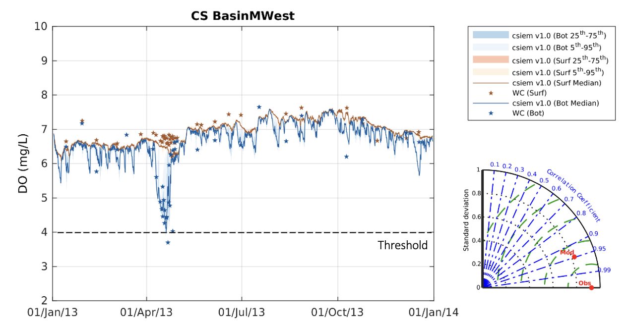 Therefore, risks associated with oxygen depletion reflect the interaction between transient density stratification, benthic oxygen demand, and near-bed density structure, rather than persistent or system-wide water-column separation. For the purpose of assessing model’s ability to resolve these dynamics (Figure 12.6), we seek to replicate the “event-scale” behaviour when low oxygen risks occur.