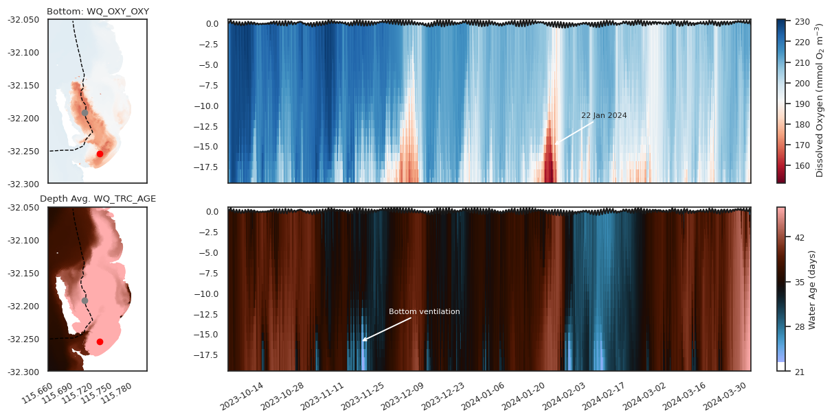 Figure 12.8. Overview of simulated dissolved oxygen (top panel) and water age (bottom panel). Vertical data taken from the red marker indicated on the maps. The low oxygen event is abruptly ended when “new” water enters into the basin from Owen Anchorage (indicated by the low water age numbers).