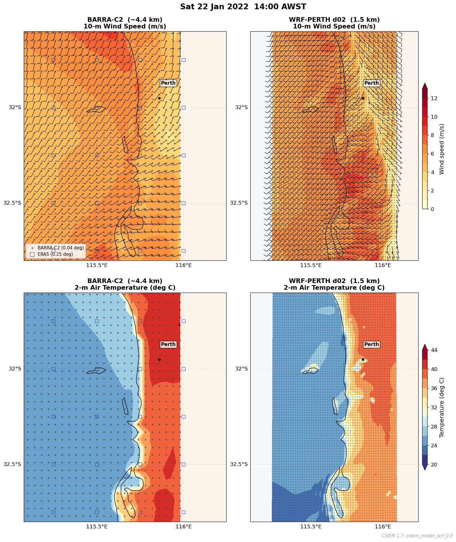 Accurate simulation of these features requires atmospheric modelling at kilometre-scale resolution — sufficient to resolve the sharp thermal and moisture gradients between the ocean surface, the narrow coastal plain, and the elevated Darling Scarp immediately inland. Coarser products (ERA5 at 31 km, or even BARRA at 1.5–4.4 km) smooth these gradients, leading to systematic biases in wind speed, direction, and timing that propagate into hydrodynamic predictions.