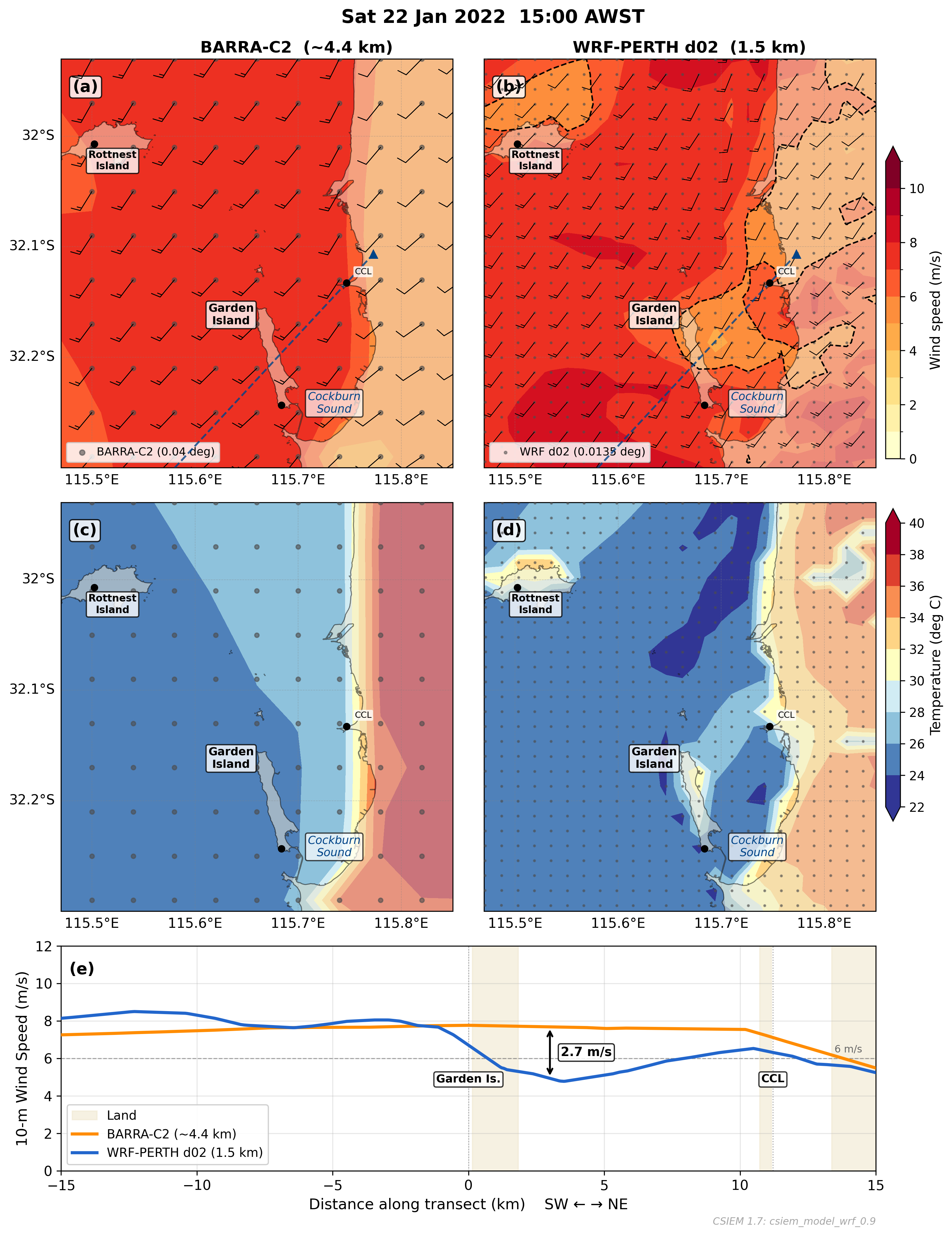 Figure 7.8. Comparison of BARRA-C2 reanalysis (~4.4 km) and WRF-PERTH d02 (1.5 km) atmospheric fields over Cockburn Sound at 15:00 AWST on 22 January 2022 during a sea breeze event. (a, b) 10-m wind speed with wind barbs; the dashed black contour in (b) marks 6 m/s, and the dashed blue line shows the transect location. (c, d) 2-m air temperature. Grey dots show native grid points for each product. Black dots mark the Rottnest Island BOM, Garden Island HSF, and Cockburn Cement (CCL) wind stations. (e) Wind speed along a SW–NE transect through Garden Island (0 km) and CCL (11.2 km); tan shading indicates land. The arrow at 3 km downwind denotes the 2.7 m/s difference between BARRA-C2 and WRF attributable to Garden Island wind sheltering that the coarser product cannot resolve. Coastline from the Australian Coastline 50K 2024 dataset (NESP MaC 3.17, AIMS).
