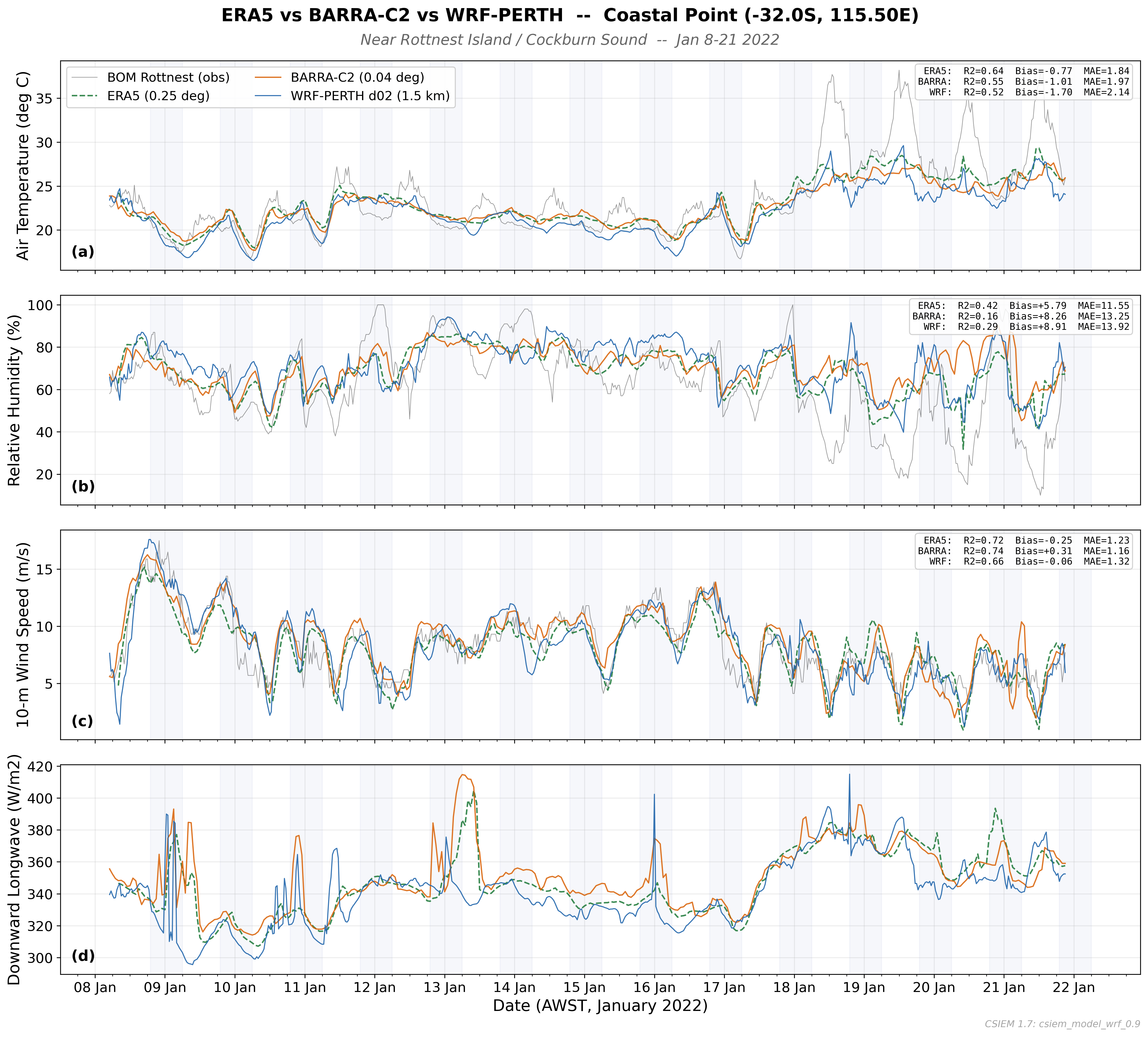 Figure 7.7. Comparison of 2-m air temperature (a), 2-m relative humidity (b), 10-m wind speed (c), and downward longwave radiation (d) at Rottnest Island (32.007°S, 115.502°E) for 8–21 January 2022. Time series from ERA5 (0.25°, dashed green), BARRA-C2 (0.04°, solid orange), and WRF-PERTH d02 (1.5 km, solid blue) are extracted at the nearest grid point to the BOM automatic weather station (thin grey line). Grey shading denotes nighttime (local sunset to sunrise). Inset boxes show R², mean bias, and mean absolute error (MAE) computed against half-hourly BOM observations.