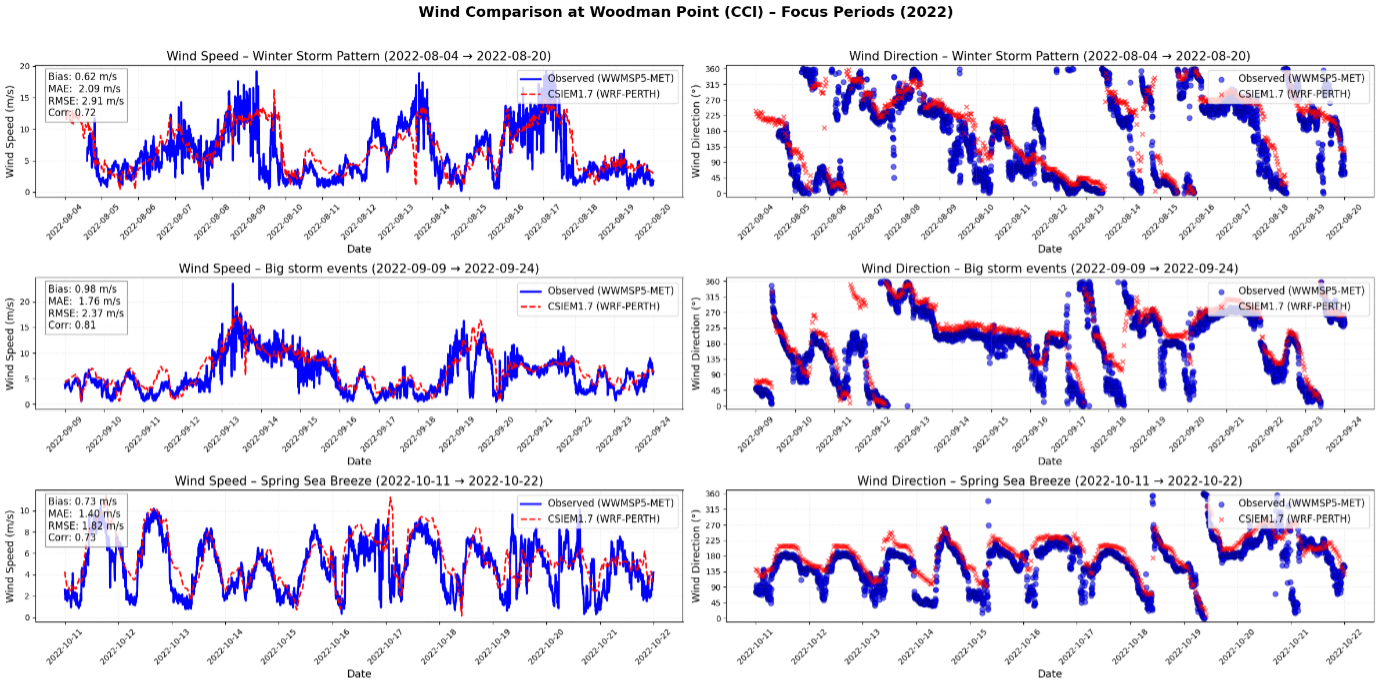 To demonstrate the model’s ability to capture key wind regimes that drive circulation in Cockburn Sound, several focus periods were identified at CCL: (a) a multiple winter storm sequence (August 4–20, 2022), (b) a strong frontal passage with rapid directional shifts (September 9–24, 2022), and (c) a representative spring sea-breeze cycle (October 11–22, 2022). An offshore focus period was also examined at Rottnest Island (February 20 – March 3, 2022).