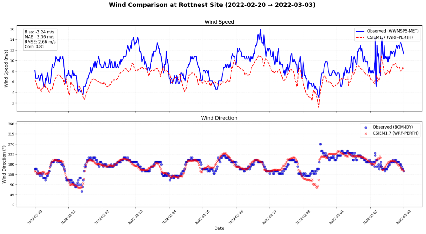 Figure 7.4. Time-series comparison of observed vs WRF wind speed and direction at Rottnest Island Airport (February 20 – March 3, 2022).