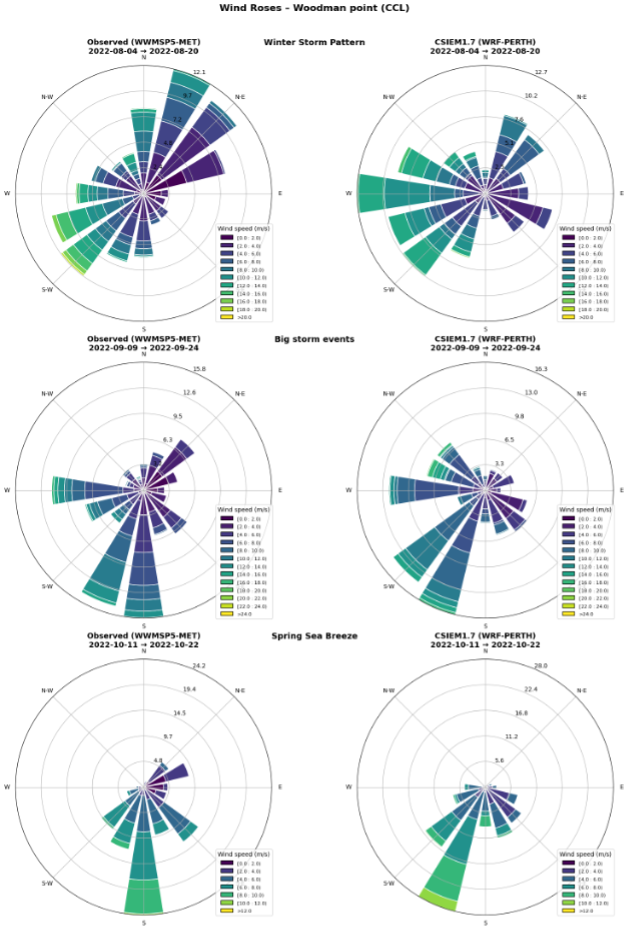 Figure 7.5. Wind-rose comparison for each focus period at Woodman Point (CCL). Left: observed winds. Right: WRF winds. Colours represent wind-speed classes (m/s), with identical binning and colour scales.