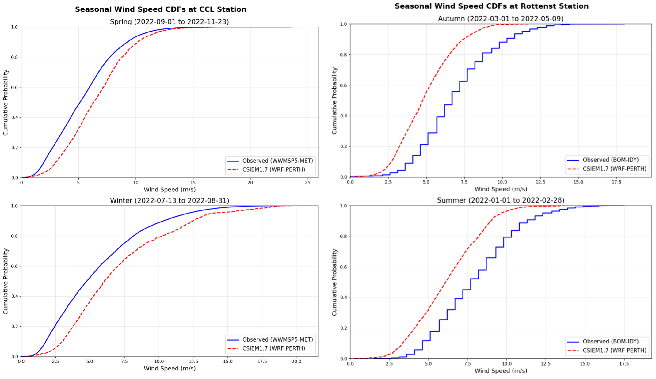 Seasonal cumulative distribution functions (CDFs) of wind speed at both stations (Figure 7.6) reveal seasonal dependencies in model bias. At CCL, the WRF CDFs are shifted rightward in winter, confirming overestimation during storm-dominated periods, while spring shows closer alignment reflecting better sea-breeze capture. At Rottnest, underestimation is evident in autumn CDFs. These patterns have implications for hydrodynamic forcing: overestimation at CCL could enhance simulated mixing and flushing, while underestimation offshore may reduce predicted open-ocean exchange.